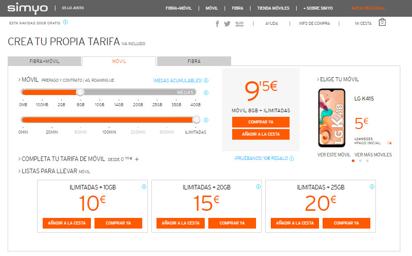 Aquí simplemente tienes que seleccionar los datos de internet que quieres, los minutos de voz, y si quieres completar, algun bono de Simyo, en el que puedes ampliar los datos móviles, algo que viene bien para periodos como Navidad o Verano.