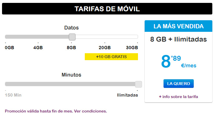 Para que veas una simulación, voy a escoger 8 Gb de datos y llamadas ilimitadas de las tarifas de contrato Simyo: